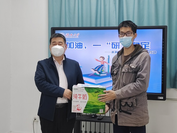发放爱心物资,让学生舒心。学院积极为学生提供力所能及的生活帮助,为被隔离的学生及时送去了牛奶、水果等慰问品,配合做好一日三餐发放。开展“加油,一‘研’为定暖心行动”,为考研学生送上牛奶,鼓励他们克服困难,力争取得优异成绩。关怀慰问抗疫志愿者,为他们送上水果,嘱咐他们保重身体,做好防护。学院还准备了口罩和消毒液等防护物资,陆续发放到每位学生手中。