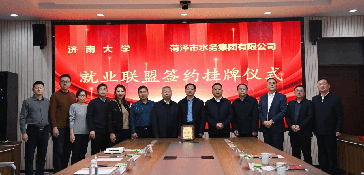 1 月 13 日下午,徐征和带队赴菏泽市水务集团调研走访,菏泽市生态环境局党组成员、市监测中心主任贾宝珍,菏泽市水务集团党委书记、董事长张防对其到来表示热烈欢迎。徐征和向对方介绍了济南大学及水利与环境学院发展近况,指出本次就业联盟的重要意义。随后菏泽市人民政府副秘书长赵连柱主持签约仪式,水利与环境学院党委书记王义与菏泽市生态环境局党组成员、市监测中心主任贾宝珍,水利与环境学院副书记副院长张良红与菏泽市水务集团有限公司常务副总经理李琦分别签署就业联盟协议。最后,三方进行座谈交流,对下一步合作的模式和具体意向进行了深入探讨,争取早日将校企合作落实到实处。