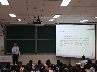 积极响应山东省推进高等学校教育教学和人才培养模式改革的号召,是山东省首批实行学分制改革的高校之一。学分制是指学生取得的学分数作为衡量和计算学生学习量的基本单位,以达到基本毕业学分作为学生毕业主要标准的教学管理制度。随后,刘处长向同学们详细介绍取得学分的途径、选课、重修及考核、毕业和结业以及肄业和延长修业年限等。刘处长还为那些对第二专业比较感兴趣的同学们进行了简单的提议。最后,刘处长鼓励新生要热爱学习,激励同学们树立目标,以不同的方式学习,踏实奋进,为未来的工作就业打下坚实基础。