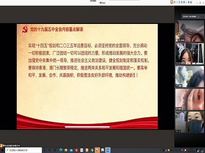 学生组织开展线上沙龙学习五中全会精神。学生干部积极发表对十九届五中全会精神的认识,其中有学生干部提出经过新中国70多年的艰苦奋斗,经过改革开放40多年的创新发展,我国迎来了前所未有的发展机遇。困难和挑战可以有千条万条,但上下同心实现发展的决心只能有一条,那就是全面抢抓我国宝贵的重要发展战略机遇期,全面转化“十四五”规划目标和远景目标,认真落实十二个方面的战略举措,创造性地谋划发展现代化发展道路,始终坚持党的全面领导、注重发挥中国特色社会主义的制度优势,始终坚持以人民为中心、坚持新发展理念、坚持深化改革开放、坚持系统观念,形成推动发展的强大合力,走出一条具有中国特色的社会主义现代化发展道路。