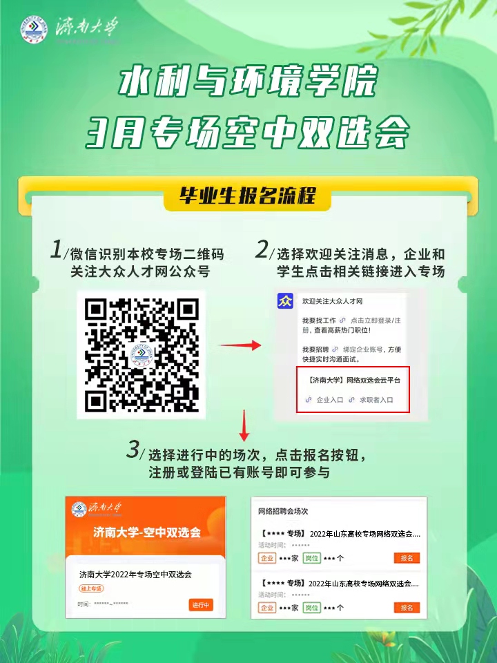 手机微信扫码关注“大众人才网”微信公众号,企业和毕业生分别点击相关按钮进入济南大学专场,点击本学院报名按钮,注册或登录已有账号即可直接参与。