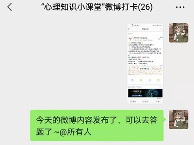 本次活动通过微博“济南大学水环心动力”和微信小圈子打卡展开,由自律会心健部工作人员每天挑选心理知识及心理问题发布在微博“济南大学水环心动力”中,参与人员需在活动期间关注微博“济南大学水环心动力”,坚持每天认真学习微博发布的心理知识,根据自己对问题的理解和心理知识的掌握情况在评论区进行做答,并将自己答题的截图发布在微信小圈子“‘心理知识小课堂’打卡圈”进行打卡。新颖的线上活动形式大大激发了同学们的积极性,同学们踊跃参加答题,董庆春、董怡彤、李倩、倪圆圆、吴向楠、尚凯月等十一位同学坚持每天答题打卡达十天及以上,其中董庆春同学的正确率最高。