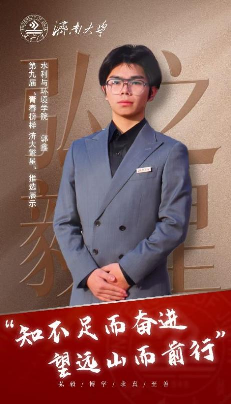 郭鑫,男,汉族,出生于2004年5月,中共预备党员,济南大学水利与环境学院水利水电工程专业2023级在读本科生。担任班级学习委员兼多门学科课代表,统筹班级学习事务,搭建师生间的桥梁。在学习中,积极进取;在工作上,尽职尽责;在生活上,乐观豁达。