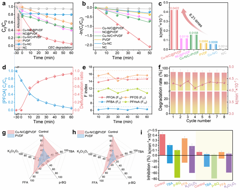 针对这一难题,研究团队通过在聚偏氟乙烯(PVDF)基质中嵌入原子级分散的Cu-N4位点,巧妙设计了一种“岛-海”结构的接触电催化系统。研究发现,Cu-N4结构域能够触发界面电子转移并诱导PVDF的β相结晶,从而显著增强压电极化和界面电场(IEFs)。这种独特的配置通过场发射效应驱动电子从PVDF基质定向注入Cu-N4活性中心。富电子的铜位点能够活化溶解氧生成•O2−,通过亲核攻击诱导C-F键极化并断裂。随后,系统产生的•OH和1O2协同作用,将低氟中间体彻底氧化矿化,构建了高效的级联还原-氧化路径。