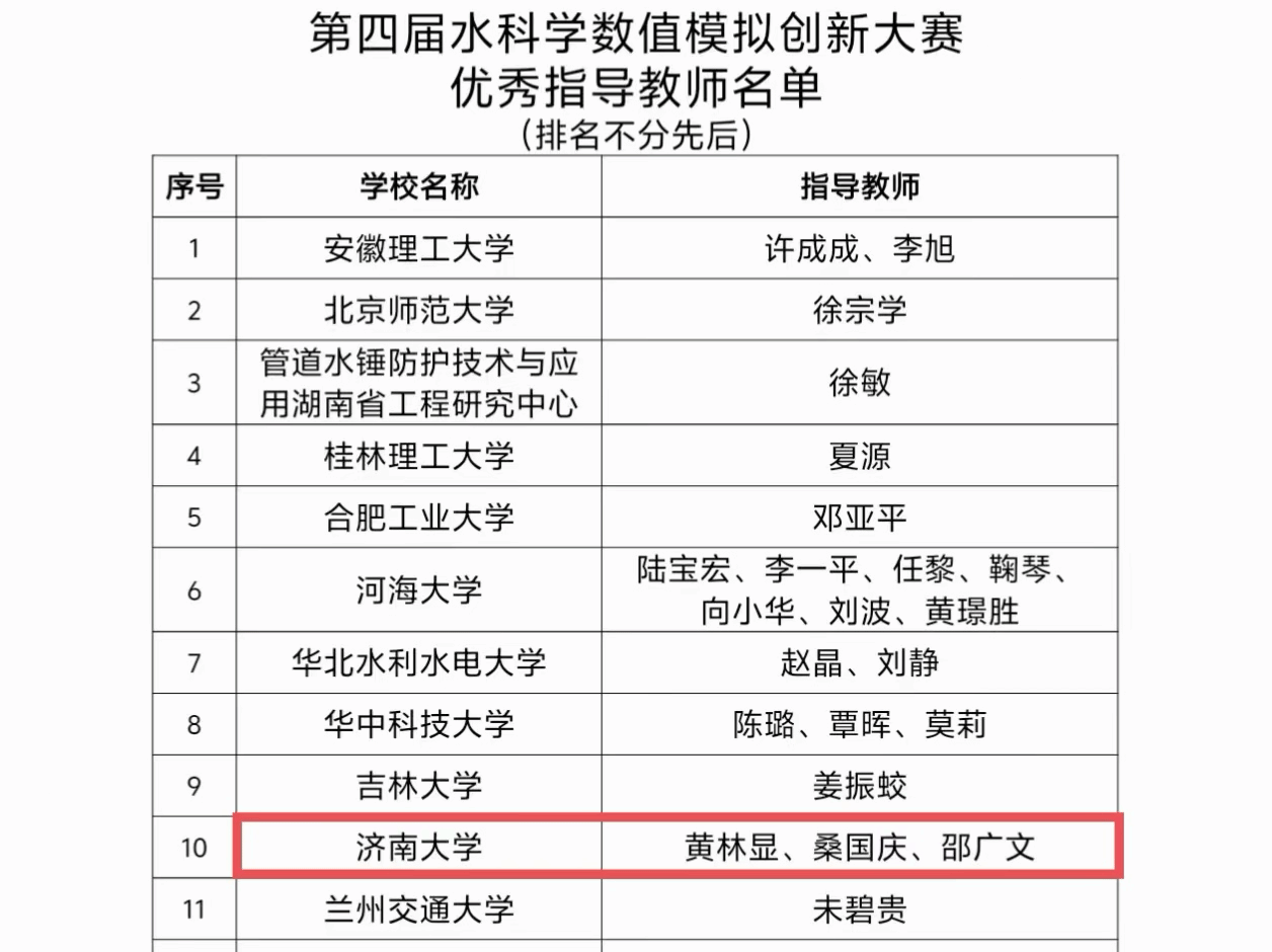 近日,第四届水科学数值模拟创新大赛圆满落幕,中国水利学会公布获奖名单。本次大赛共吸引了全国80多家高校、科研院所484支队伍报名参赛,经初赛、复赛、决赛角逐,最终评出一等奖10项、二等奖20项、三等奖43项及优秀奖73项。水利与环境学院参赛团队在本次大赛中获得一等奖1项、三等奖2项,荣获“优秀组织奖”。学院教师黄林显、桑国庆、邵广文获评“优秀指导教师”。
