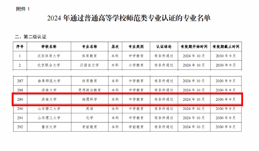 近日,教育部办公厅发布了《关于公布2024年通过普通高等学校师范类专业认证及认证中期审核专业名单的通知》(教师厅函〔2024〕20 号),我院地理科学专业顺利通过师范类专业二级认证,认证有效期六年(2024年10月至2030年9月)。