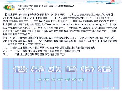 为全面落实新冠肺炎疫情防控措施并呼吁更多同学关注水资源问题,本次世界水日系列宣传以线上活动为主,积极发挥互联网的宣传作用,充分利用公众号、微信群、QQ群以及视频社交软件等网络和新媒体的传播优势,自3月11日起在线上分别推出了以下活动: “青山绿水”世界水日作品线上征集活动、“三行情书诉水情”网络征集活动以及网上发放调查问卷活动。活动发出后,水利与环境学院的学子们通过制作宣传海报、拍摄照片和视频等方式积极响应,足不出户就了解到节水和水环境保护知识,体现出他们对水环境保护事业的关心。