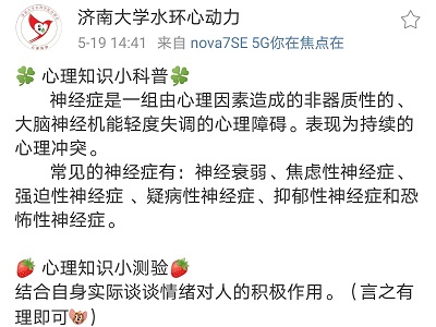 为加强大学生的心理健康教育,普及心理健康知识,引导学生充分认识心理健康对于个人成长的重要意义,从而关注自身发展,开发自我潜能,促进自我身心健康。济南大学水利与环境学院自律会心健部于5月9日至5月21日特此开展“心理知识小课堂”微博打卡活动。