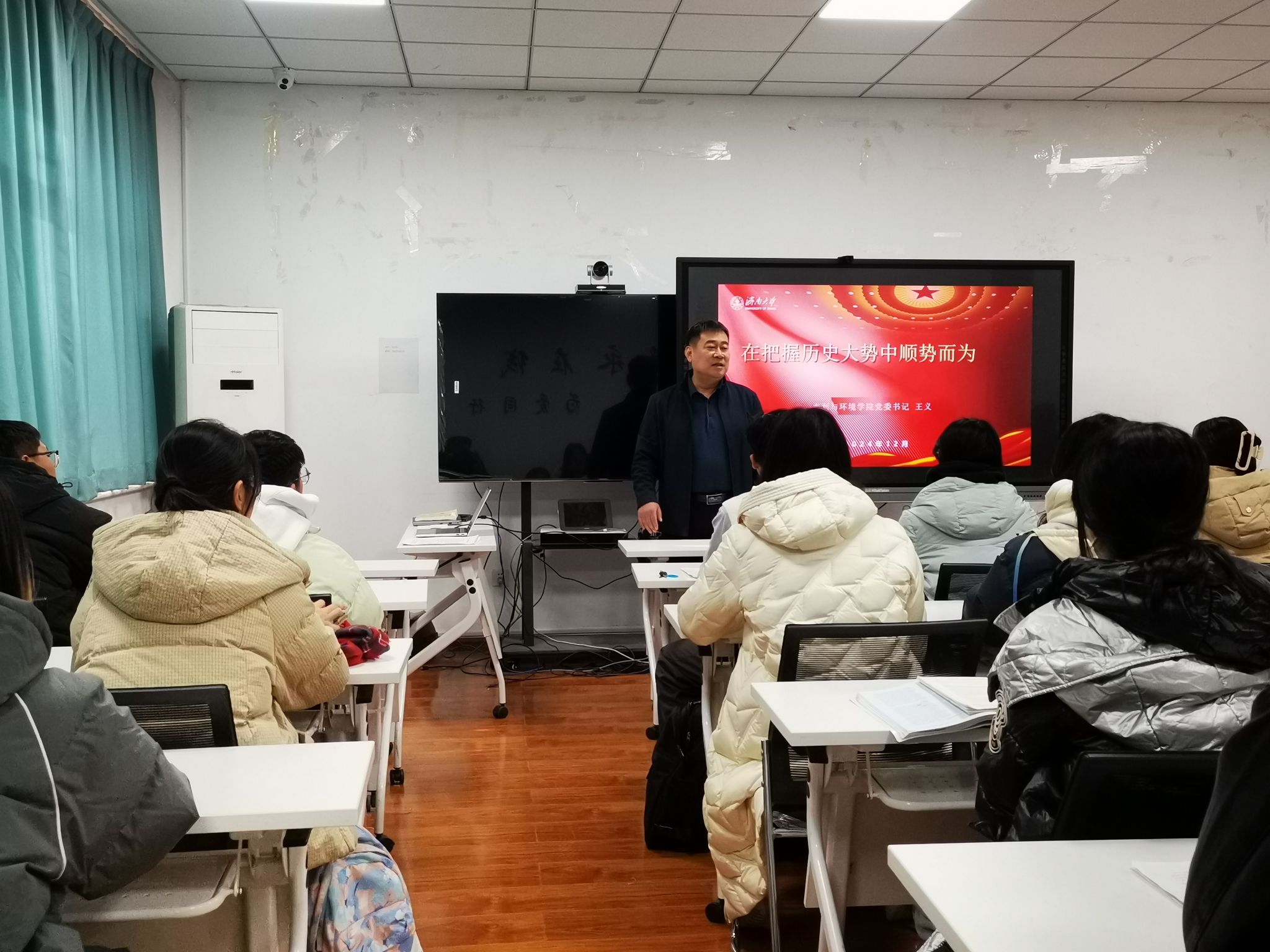 为深入贯彻落实习近平总书记关于“大思政课”的重要指示,坚持不懈用习近平新时代中国特色社会主义思想铸魂育人,引领学院入党积极分子领悟习近平新时代中国特色社会主义思想真理伟力、思想伟力、实践伟力,12月11日,水利与环境学院党委书记王义以《在把握历史大势中顺势而为》为题,为学院入党积极分子上了一堂生动的思政课。
