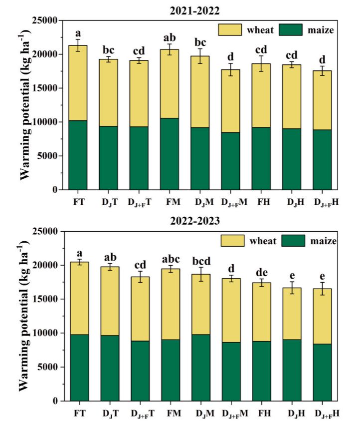 亏缺灌溉和生物炭施用的相互作用有效地减少了土壤温室气体的整体排放,尤其是在高生物炭施用(H)条件下,玉米和小麦拔节期亏缺灌溉使全球增温潜势(GWP)降低了15.9 %,且产量损失最小,仅为4.86 %。综上所述,合理的亏缺灌溉制度,结合适量的生物炭施用,可以在减少温室气体排放的同时最大限度地减少作物产量损失,是一种控制温室气体排放的有效策略。