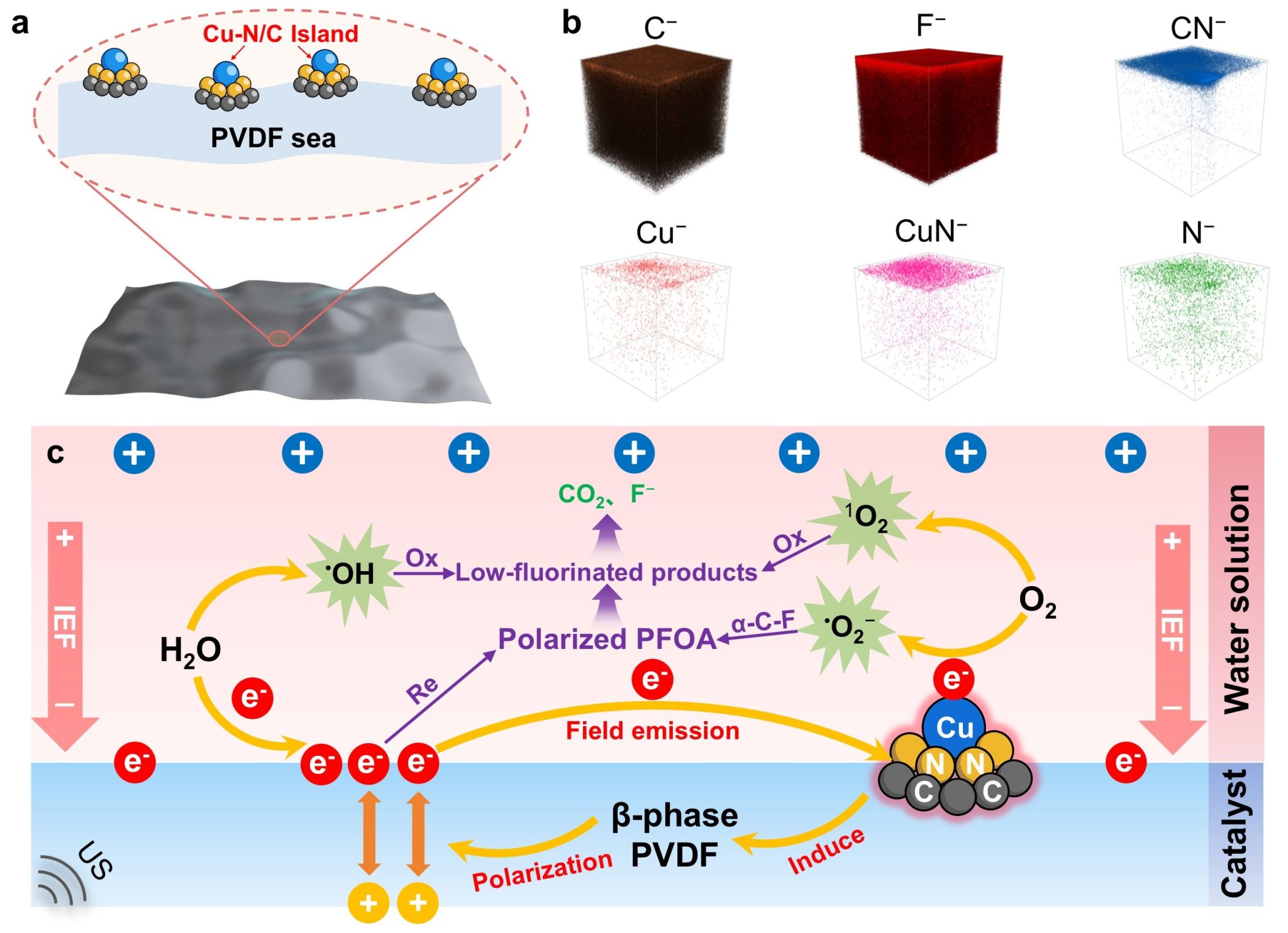 针对这一难题,研究团队通过在聚偏氟乙烯(PVDF)基质中嵌入原子级分散的Cu-N4位点,巧妙设计了一种“岛-海”结构的接触电催化系统。研究发现,Cu-N4结构域能够触发界面电子转移并诱导PVDF的β相结晶,从而显著增强压电极化和界面电场(IEFs)。这种独特的配置通过场发射效应驱动电子从PVDF基质定向注入Cu-N4活性中心。富电子的铜位点能够活化溶解氧生成•O2−,通过亲核攻击诱导C-F键极化并断裂。随后,系统产生的•OH和1O2协同作用,将低氟中间体彻底氧化矿化,构建了高效的级联还原-氧化路径。
