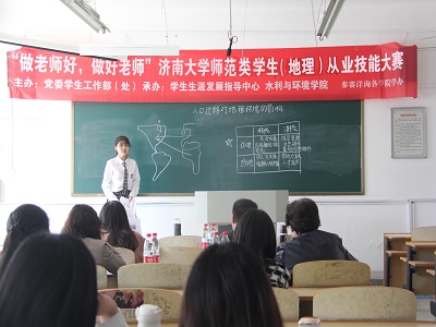 为适应新时代教师队伍建设改革要求,提升水利与环境学院师范生从业技能水平,为第九届山东省师范类高校学生从业技能大赛选拔人才,4月27日,济南大学水利与环境学院承办济南大学师范类学生(地理)从业大赛校级决赛。比赛邀请徐占福老师、吕淑琦老师担任校外嘉宾评委,周保华老师、解伏菊老师、刘展宏老师、宋鹏老师任校内评委。