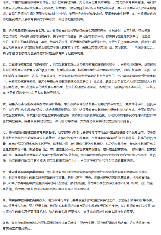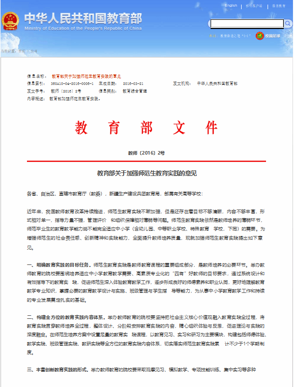 2016教育部关于加强师范生教育实践的意见